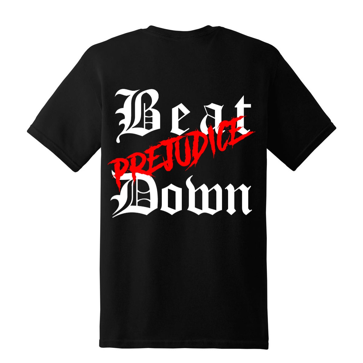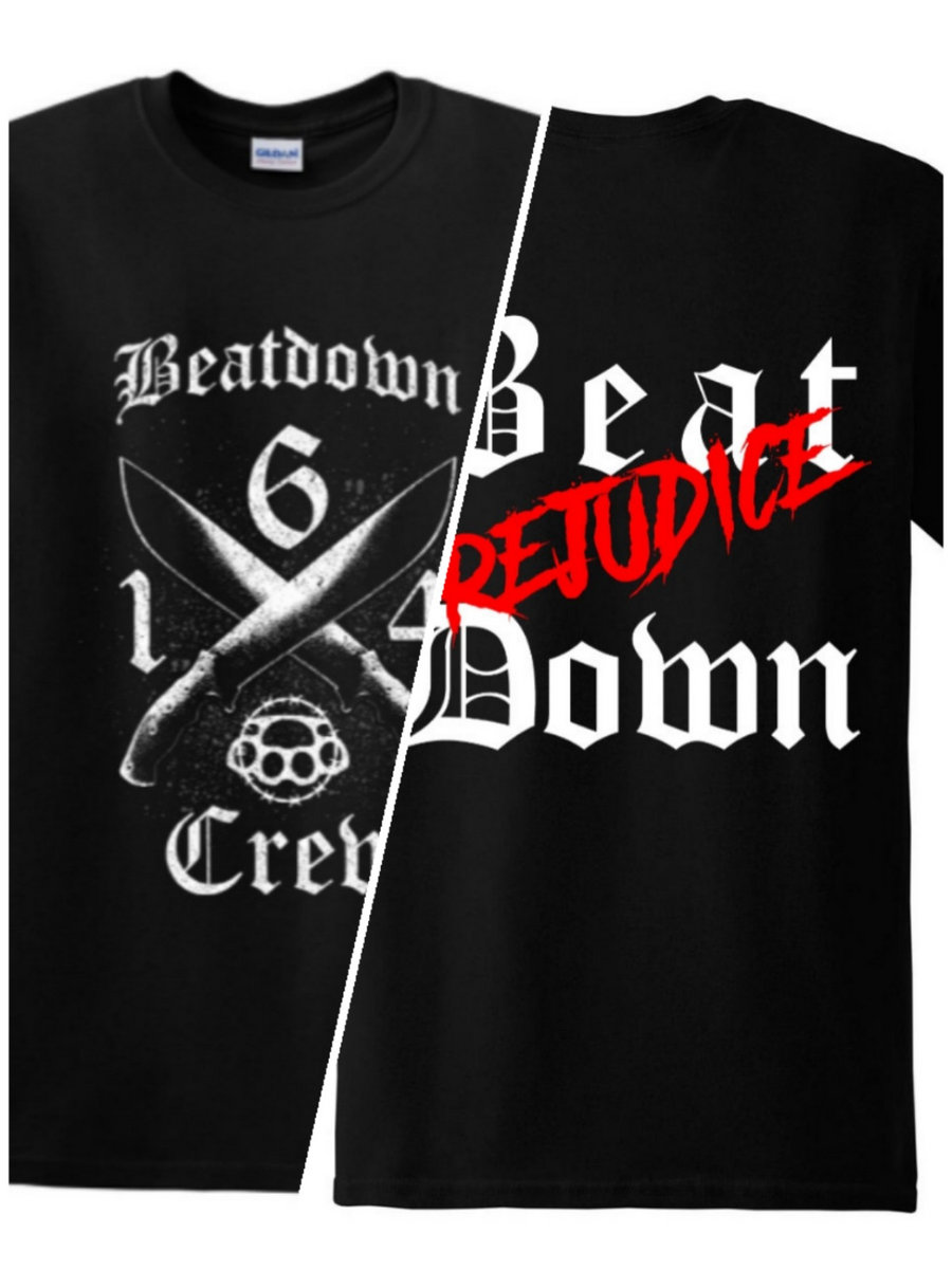 164 Beatdown Crew Logo on the Front and "Beat 'prejudice' Down" as backprint. (The pictures are just to show where it will be placed and which size is planned! Final print can be a little bit different in size, but will be in good quality don't worry)